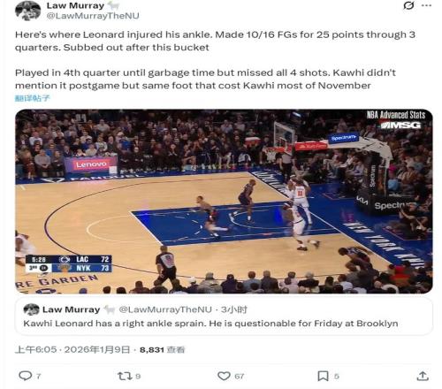 这次受伤的过程充满了偶然与无奈。对阵尼克斯的第三节,伦纳德在一次底线跳投命中后,回防时不慎踩到了场边一位球迷的脚,导致右脚踝再次扭伤。在他受伤退场前,仅仅两节半的时间,他就已16投10中高效砍下25分,状态火热。尽管第四节他试图带伤坚持,但明显受到影响,4次出手全部偏出。这次意外的踩踏,不仅中断了他个人的得分表演,更可能直接扭转快船刚刚好转的赛季轨迹。