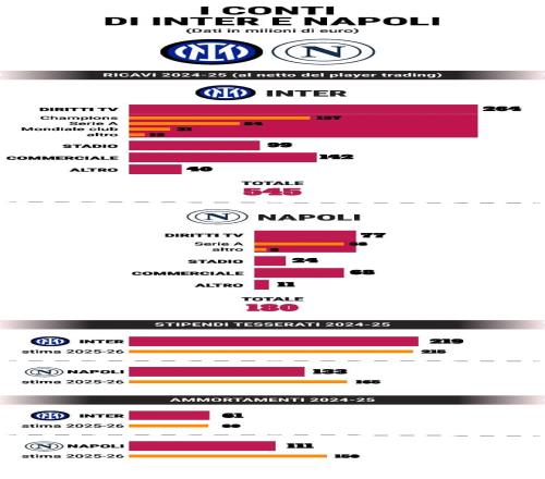 北京时间1月12日,意甲联赛第20轮将迎来一场焦点大战,国际米兰将坐镇主场对阵那不勒斯。赛前,《米兰体育报》全面梳理了两家豪门俱乐部目前的财政状况和经济实力。