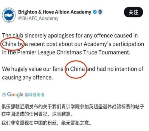 随后,布莱顿俱乐部删除照片并道歉:“针对近期发布的帖子在中国造成的任何冒犯,俱乐部深表歉意。我们非常重视中国的球迷,我们绝无冒犯之意。”