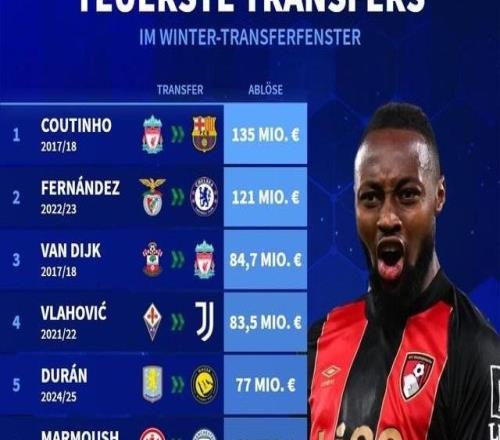 德转列冬窗历史最贵交易榜:库鸟居首,塞门约7200万欧第七
