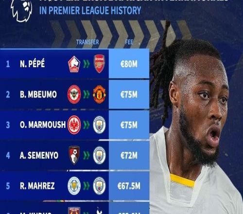 曼城从伯恩茅斯签下加纳前锋塞门约,据悉转会费为7200万欧,据德转统计,塞门约是英超历史上转会费第四高的非洲国...